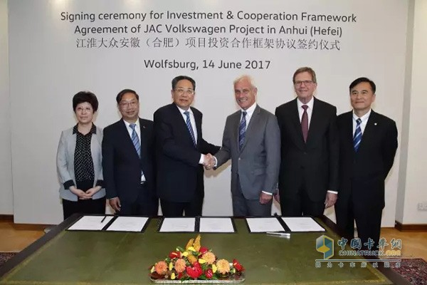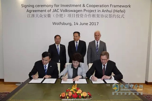 2017年6月14日,合肥市政府、江淮汽车与大众汽车集团三方在德国沃尔夫斯堡共同签署投资协议。该协议的签订,标志着江淮汽车与大众汽车集团的合作迈出了重要的一步。在该协议框架下,江淮汽车与大众汽车将共同向快速增长的中国市场推出电动车型产品。