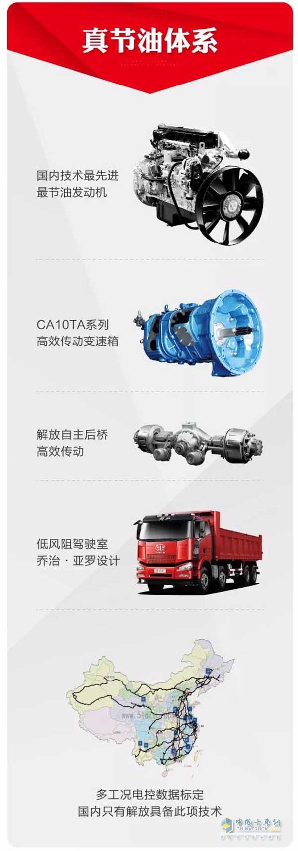 发动机由单体泵更改为共轨技术线路,结合解放特有的“体系节油”核心技术,百公里比竞品节油2-3L
