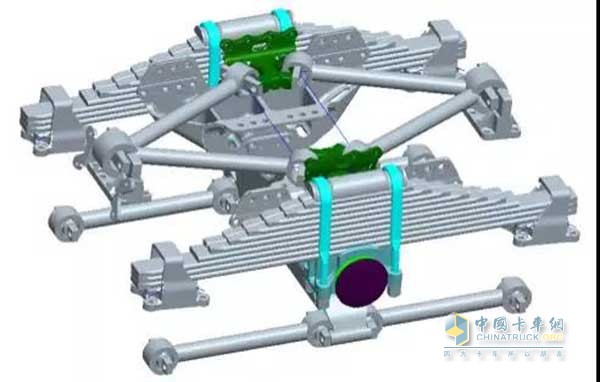 采用全新轻量化2U悬架,改变平衡悬架与车架连接形式,使悬架受力更合理,平衡悬架与车架重合度超过2m,提高重要部位抗静弯、抗横弯、抗扭性能,延长车架寿命,一体式板簧座免维护橡胶衬套,避免油润滑轴承的漏油问题