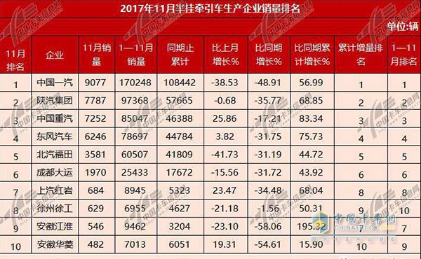 2017年11月半挂牵引车生产销量排名