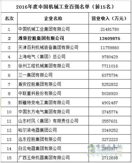 潍柴以年营收1341亿元 居2016年度中国机械工业百强第二位